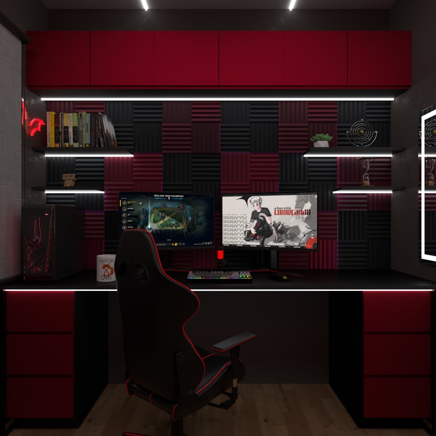 Em parceria com o escritório Arquiteto Gamer, este projeto de design de interiores apresenta um quarto gamer com uma estética marcante e moderna, explorando elementos visuais e funcionais que o transformam em um espaço dedicado ao lazer e entretenimento digital.