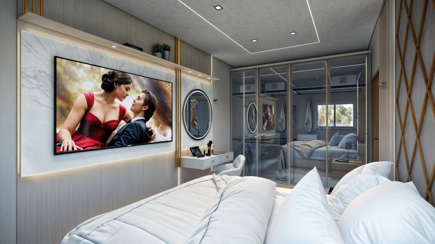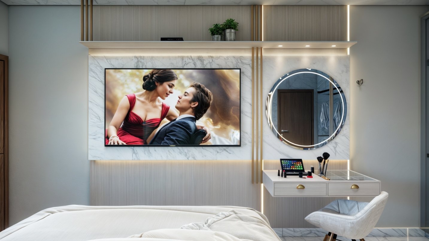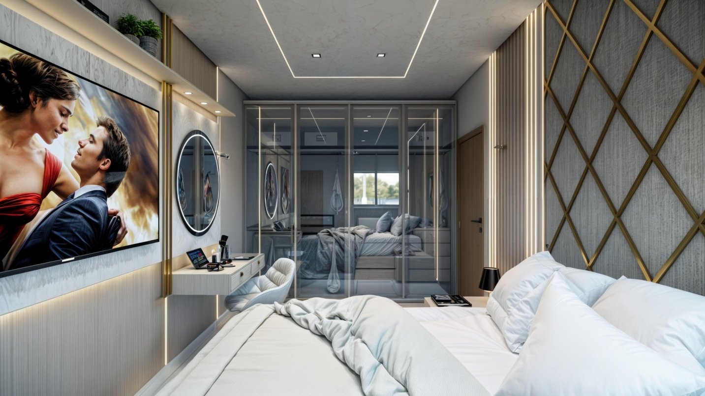 A iluminação embutida no gesso não apenas é funcional, mas também amplia o espaço, criando uma atmosfera acolhedora e relaxante, ideal para um quarto. Integrando funcionalidade e estética, uma penteadeira com espelho circular foi incluída, perfeita para a rotina de beleza. A televisão fixada na parede otimiza o espaço, proporcionando entretenimento sem comprometer a estética.