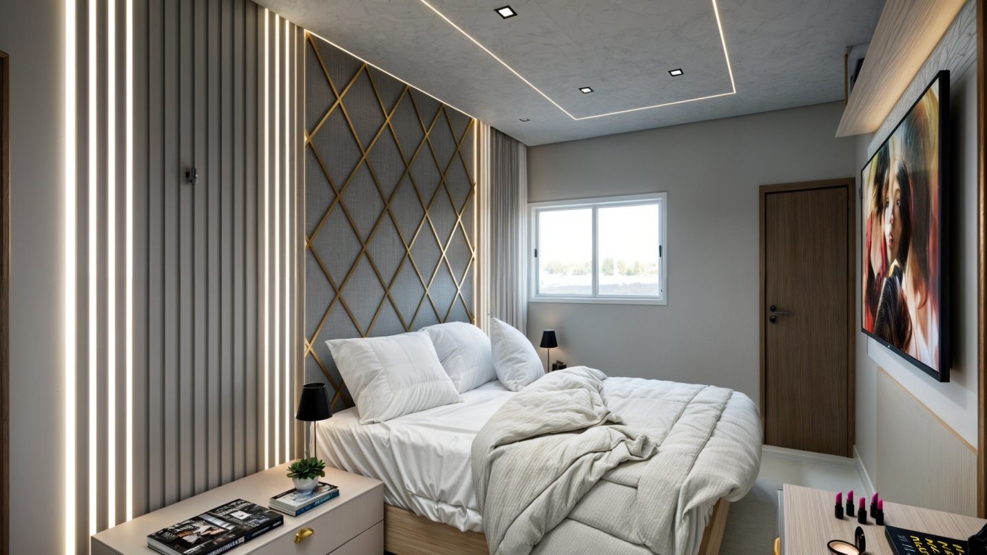 O projeto presencial em Sousa-PB apresenta um quarto com uma estética moderna e sofisticada, caracterizada por linhas limpas, uma paleta de cores neutras e detalhes em dourado que adicionam um toque de luxo.
