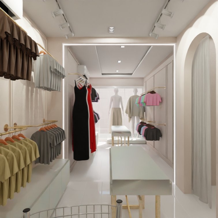 A disposição do layout é intuitiva, com áreas bem definidas para cada função: exposição de roupas, provadores e caixa. Elementos como prateleiras e araras em tons dourados não apenas organizam os produtos de forma eficiente, mas também agregam sofisticação ao ambiente.